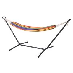 En toch ligt deze hangmat net zo lekker als een hangmat van 100% katoen. Ook zorgt het polyester dat de hangmat minder uitrekt en beter bestand is tegen een regenbui.