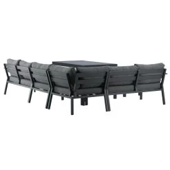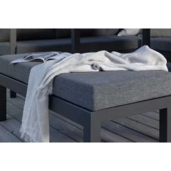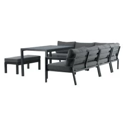 Deze hoek tuinset Alentejo is ideaal voor een grote tuin, terras of patio hebben Met zijn moderne tijdloze design is dit een aanwinst voor lange en gezellige avonden met vrienden en familie Ook perfect voor een kopje koffie of lekker een boek lezen in de zon Het frame is van zwart gepoedercoat aluminium met grijze kussens Aluminium is duurzaam en licht in gewicht