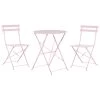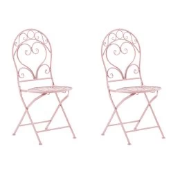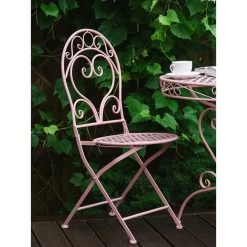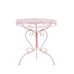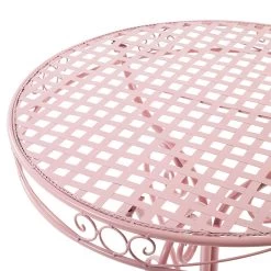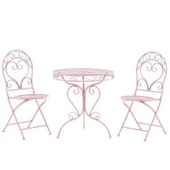 Prachtige 3-delige bistroset met een vintage touch maakt een opvallende toevoeging aan elke tuin of balkon. Het roze, poedergecoate frame met prachtig open scrollwerk straalt een romantische sfeer uit. Gemaakt van ijzer, is deze buiten set gemakkeli