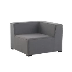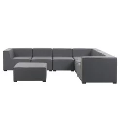 Dit veelzijdige set bestaat uit drie hoekbanken, drie middenstukken zonder armleuningen en een vierkante bijzettafel. De onderdelen zijn allemaal in elkaar te schuiven en met elkaar te verbinden middels een modulair verbindingssysteem, waardoor een