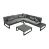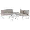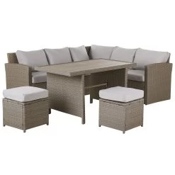 Creëer een perfecte plek voor familiebijeenkomsten of vriendenbijeenkomsten in je tuin met deze tijdloze tuinmeubelset. De set bestaat uit een hoekbank, eettafel en twee voetenbankjes. Duurzame constructie is gemaakt van hoogwaardig aluminium en bed