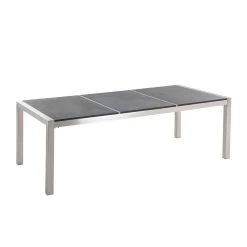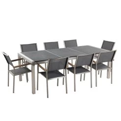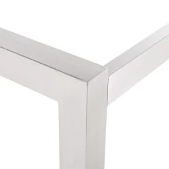 Een exclusieve tuinset die een stijlvolle touch geeft aan je tuin of terras. Met een mooie combinatie van roestvrij staal en glas voor een moderne uitstraling. Het tafelblad is weerbestendig en de lichte kleur past perfect bij de zilveren contouren.