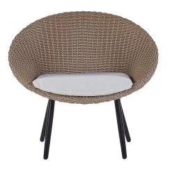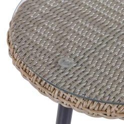 Dit balkonset bestaat uit twee comfortabele en stabiele stoelen en een bijzettafel in trendy kleuren, ideaal voor een lunch of koffiepauze. De meubels zijn volledig gemaakt van stevig staal en hoogwaardig lichtbruin wicker vlechtwerk met bijpassende