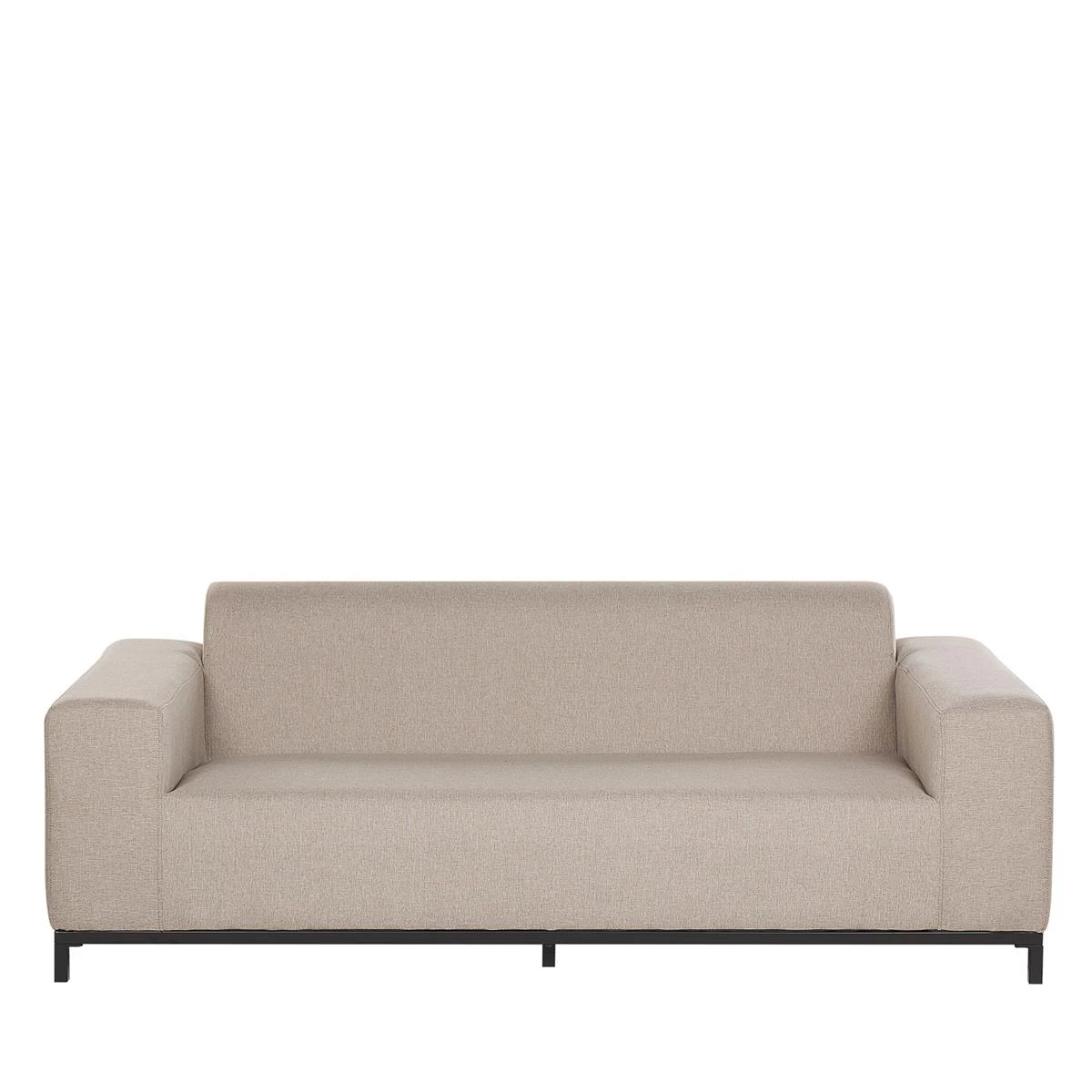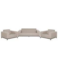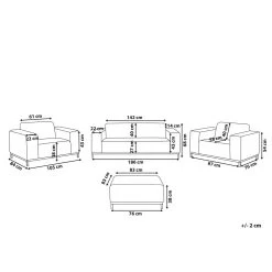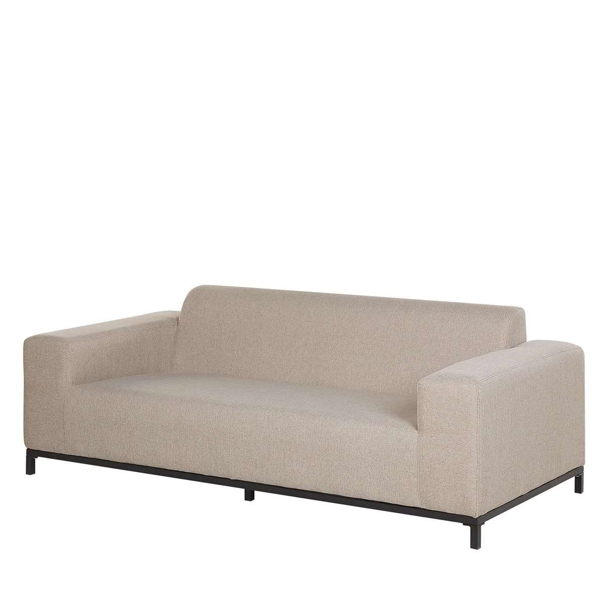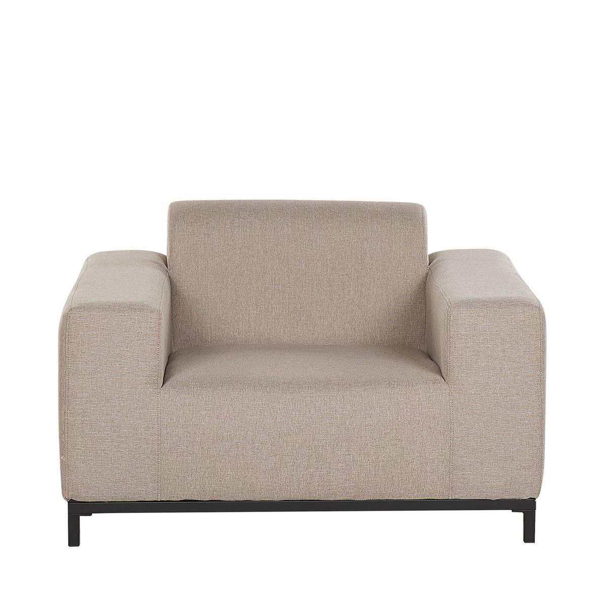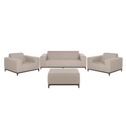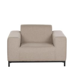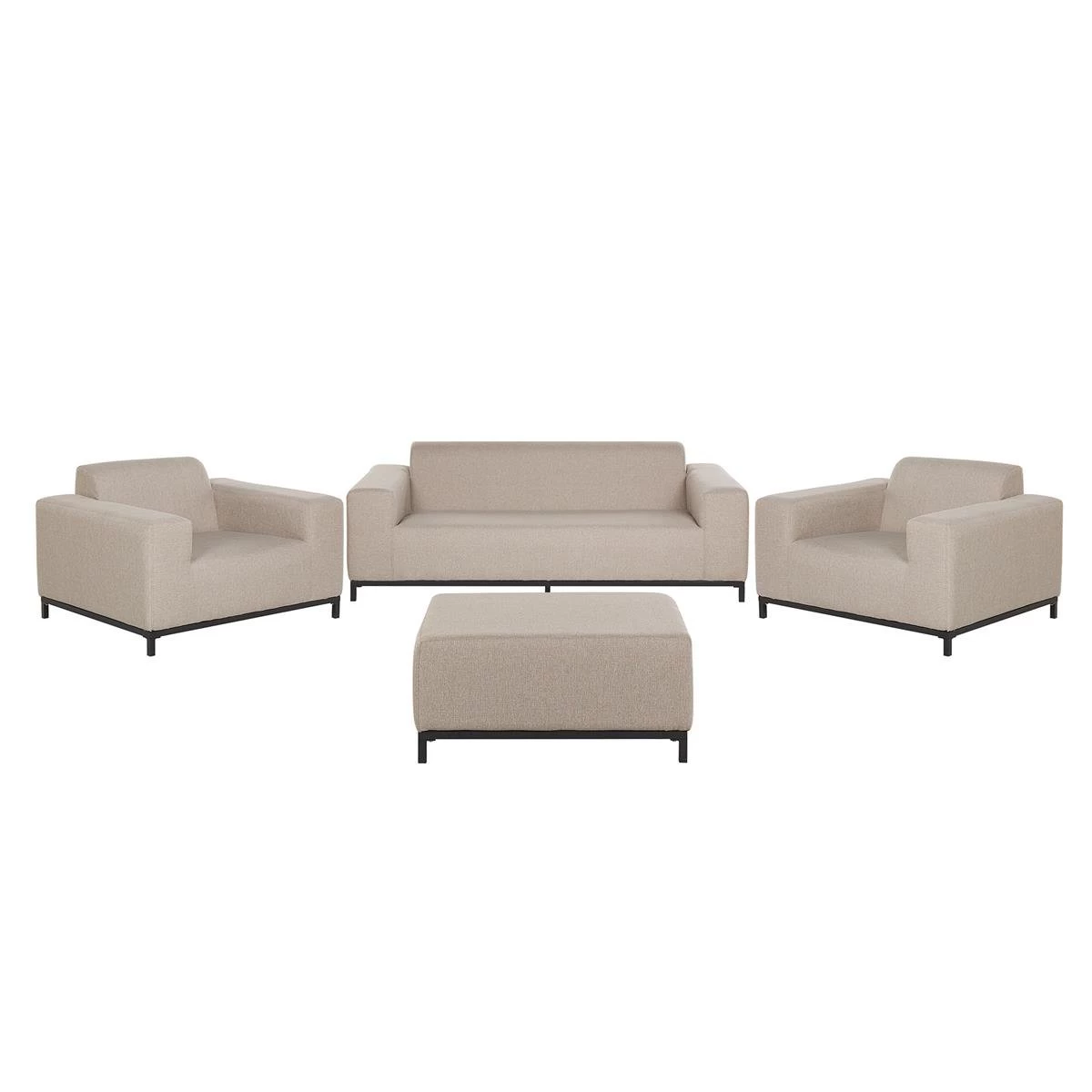 Deze loungeset bestaat uit een driezitsbank, 2 loungestoelen met armleuningen en een vierkante ottomaan. Het stabiele, zwarte onderstel is gemaakt van gepoedercoat metaal. Deze meubels zijn perfect om het hele jaar door te gebruiken, zowel binnen al