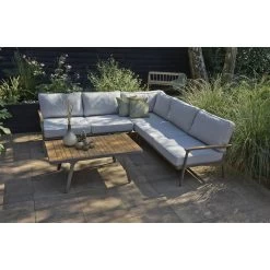 Lekker ontspannen in de comfortabele Orlando hoekset. Deze set heeft een aluminium frame en is afgewerkt met teak FSC® armleggers. De hoekset is voorzien van mooie en comfortabele kussens met een buitenstof van olefin en een fast dry foam vulling. Deze foam is waterdoorlatend, schimmel- en rotvrij. Hierdoor kun je de set met een gerust hart het hele tuinmeubelseizoen buiten laten staan.