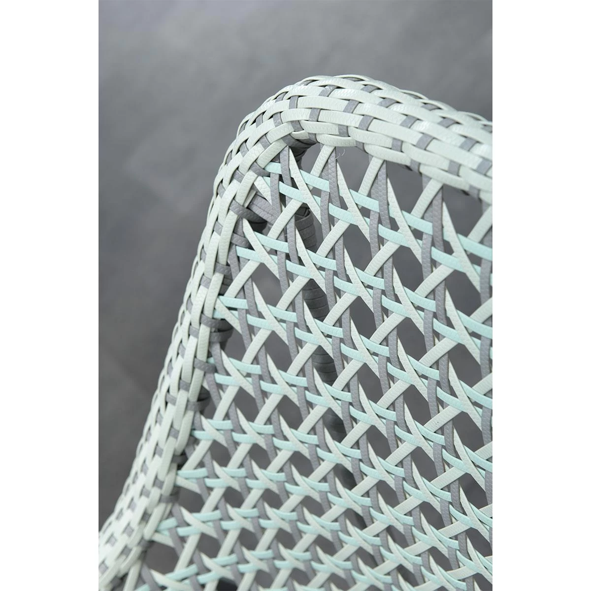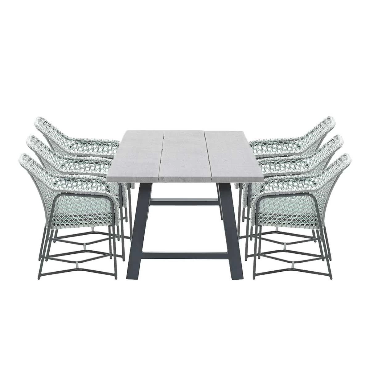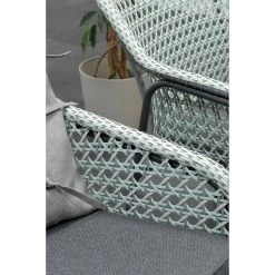 De Timmy tuinstoel heeft een aluminium frame en een afwerking van zachtgroen wicker. Tuintafel Leuven is volledig van aluminium. Afmeting stoel: 69 x 61 x 80,5 cm. Afmeting tafel: 220 x 100 cm.