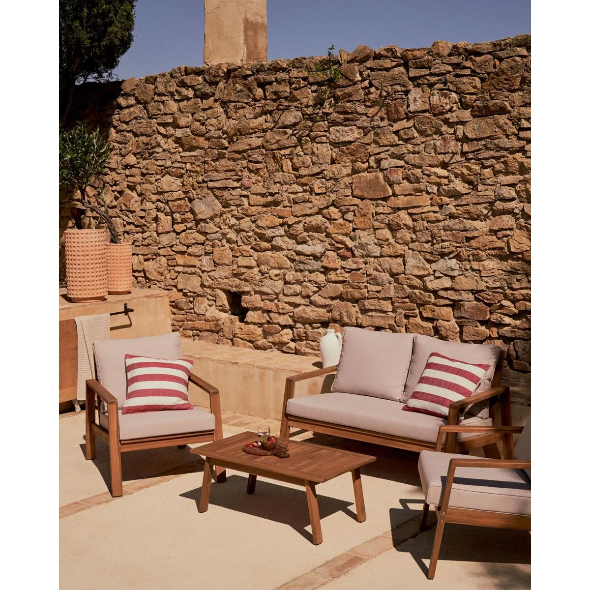 Set Frares van 2-zitsbank, 2 fauteuils en salontafel in massief acaciahout