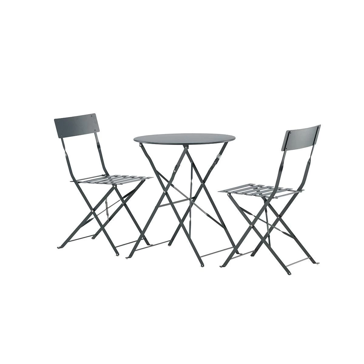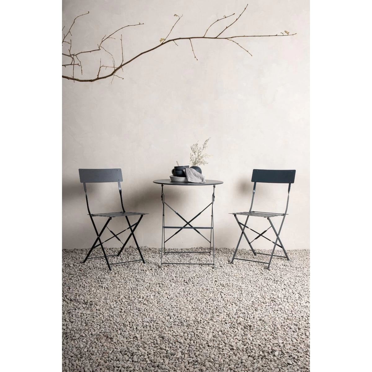 De set bestaat uit twee stoelen en een tafel gemaakt van metaal. Dankzij de donkergrijze kleur heeft de bistroset een chique uitstraling en passen de meubels bij elke stijl in de tuin. Het handige van deze set is dat zowel de stoelen als de tafel opvouwbaar zijn. Zo kan je ze dus netjes opruimen en ruimte maken als je ze niet gebruikt. Zet de Lovisa tuinset op een mooi plekje in de tuin en geniet er van een kopje koffie of glaasje wijn op een mooie zomerdag.