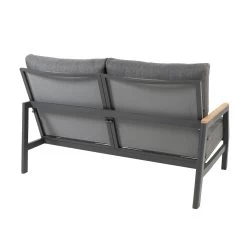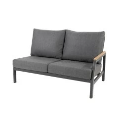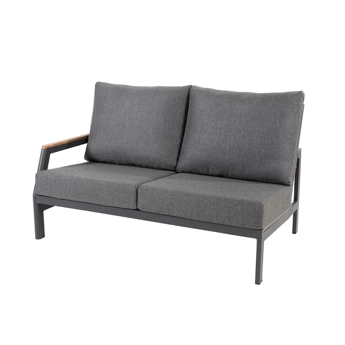De Ravenna loungebanken links en rechts hebben een antraciet RVS onderstel en een afwerking van teakhout op de armleuningen. Uit te breiden met het Ravenna midden- en hoekelement. Afmeting banken: 144 x 89 x H84,5 cm. Incl. all-weather kussens.